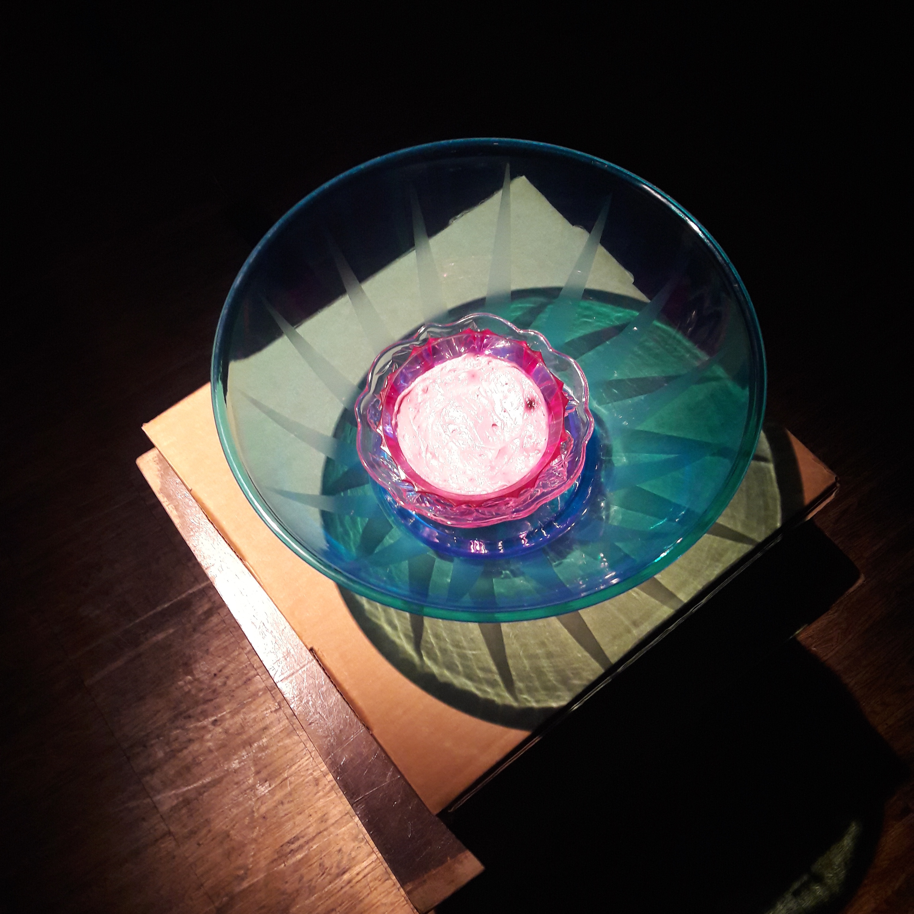 Pudding speaker (plastic crystal bowls, instant pudding, cupboard box and transducer) played at Ausland 8.10